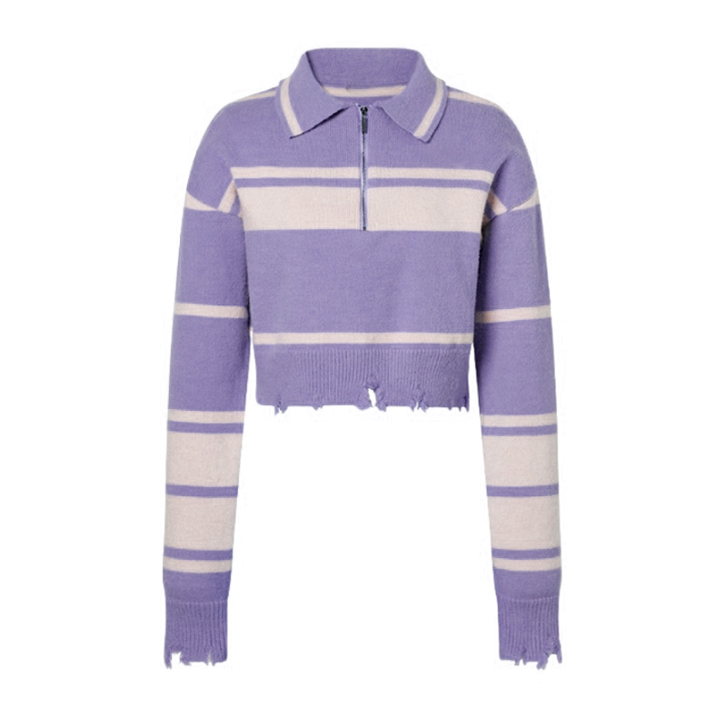 Cropped Zip-Up Collared Striped Sweater
